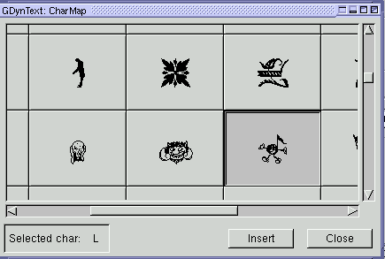 Another way to insert your icons (and the one I prefer when I am looking for new icons) is to use the CharMap window which you get by pressing on the button that is the most right in the top row in the GDyntext window. In the charmap you can see all available characters of a font and can insert them in your image. Left at the bottom there is also a small field where you can see which key it is.
