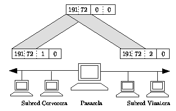 A vlager, que actúa de pasarela entre las redes, se le asigna el número de máquina 1 en ambas redes, lo que significa que tiene las direcciones IP, 191.72.1.1 y 191.72.2.1, respectivamente. La figura 5.1 muestra las dos subredes y la máquina que actúa de enlace.